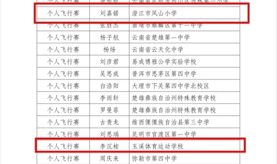 玉溪市科协组织参加第9届全国青少年无人机大赛,其中玉溪市第三小学、玉溪体育运动学校、澄江市凤山小学的3名同学入选第9届全国青少年无人机大赛总决赛个人飞行赛;玉溪第四小学、玉溪市红塔中学、江川区大街小学、江川区大街中学的4名同学入选第9届全国青少年无人机大赛总决赛编程挑战赛。