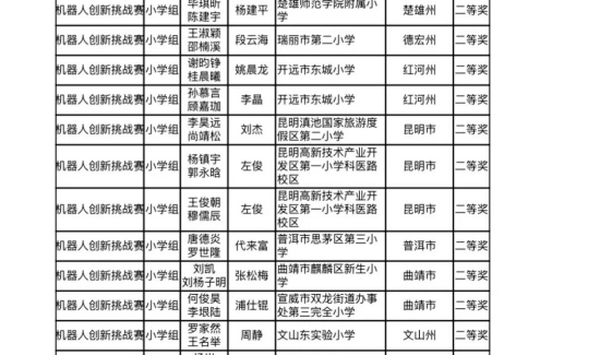 玉溪代表队在青少年科技创新成果竞赛中斩获一等奖1个,三等奖12个;在科技辅导员科技创新成果竞赛中斩获一等奖1个,三等奖6个;在机器人竞赛单元中斩获一等奖2个,三等奖10个;获评1个优秀组织工作者奖。